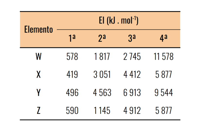 As letras W, X, Y e Z designam quatro elementos escolhidos entre aqueles das colunas 1, 2 e 13 da tabela periódica (antigas colunas IA, IIA e IIIA). Seus átomos têm as energias de ionização mostradas na tabela.