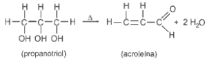 O propanotriol, quando submetido a um aquecimento rápido, desidrata-se, formando a acroleína que apresenta um cheiro forte e picante. Essa propriedade constitui um meio fácil e seguro de se diferenciarem as gorduras verdadeiras dos óleos essenciais e minerais, pois, quando a gordura é gotejada sobre uma chapa superaquecida, também desprende acroleína. Observe o que acontece com o propanotriol: