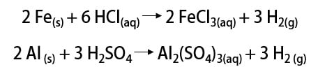 A primeira reação ocorre porque o metal reage com o ácido clorídrico, que é forte. O produto é o gás hidrogênio e o cloreto de zinco (ZnCl2), uma vez que é uma reação de dupla-troca. Dessa forma é possível dizer que o metal dos reagentes era o zinco.