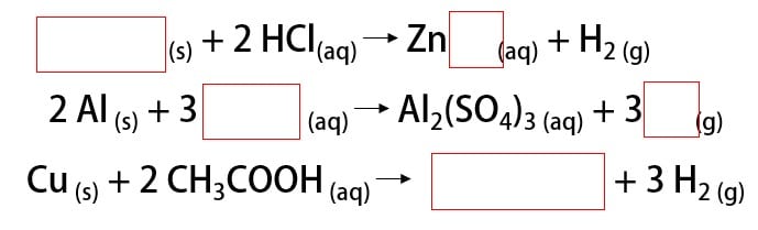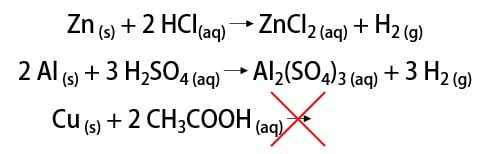 Complete as lacunas das reações de metais com ácidos abaixo, indicando se há ou não reação de formação de gás hidrogênio.