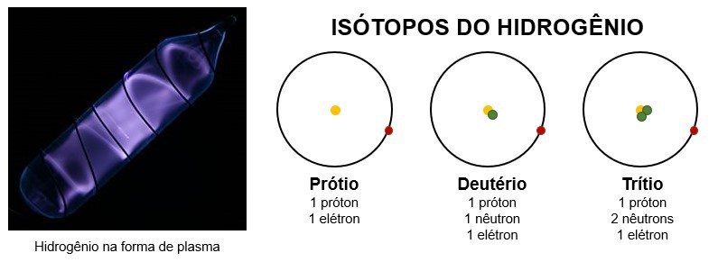 - Possui três isótopos principais: o prótio, o deutério e o trítio.