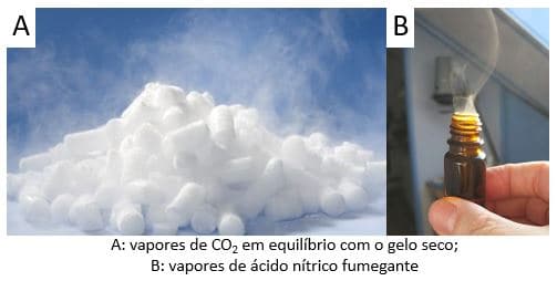 Já os vapores dizem respeito às substâncias no estado gasoso que são facilmente liquefeitas, ou seja, é um gás instável. O vapor coexiste tanto com sólidos, como é o caso do gelo seco (dióxido de carbono sólido) ou líquidos (vapores de ácido nítrico fumegante), por exemplo.